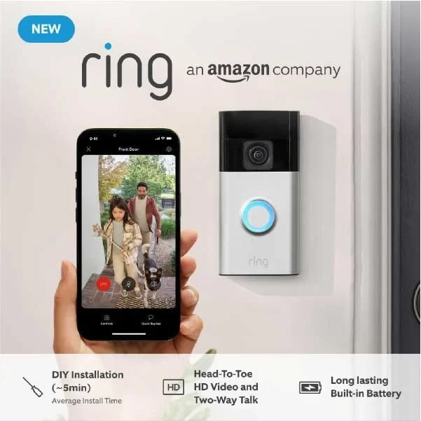 The New Ring Battery Video Doorbell (2024) offers a wireless, DIY solution with a sleek design and easy 5-minute installation. It features HD video with a head-to-toe view, built-in rechargeable battery, and advanced motion detection. Perfect for enhanced home security with seamless monitoring.