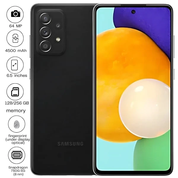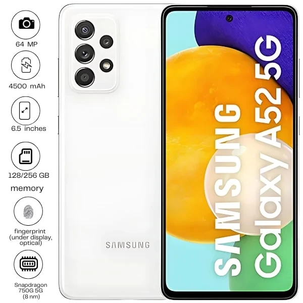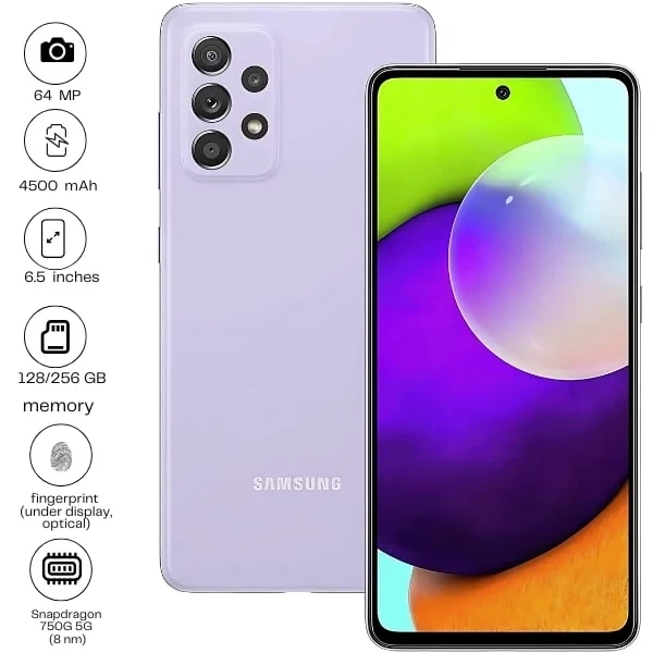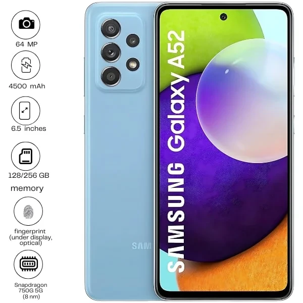The Samsung Galaxy A52 is a mid-range smartphone featuring a 6.5-inch Super AMOLED display with a 90Hz refresh rate for smooth visuals. Powered by the Snapdragon 720G processor, it delivers solid performance for gaming and multitasking. The device boasts a quad-camera setup, including a 64MP main sensor with OIS, a 12MP ultrawide, a 5MP macro, and a 5MP depth sensor, ensuring versatile photography. A 4500mAh battery supports 25W fast charging for all-day use. Additional highlights include stereo speakers, an in-display fingerprint sensor, and IP67 water and dust resistance.