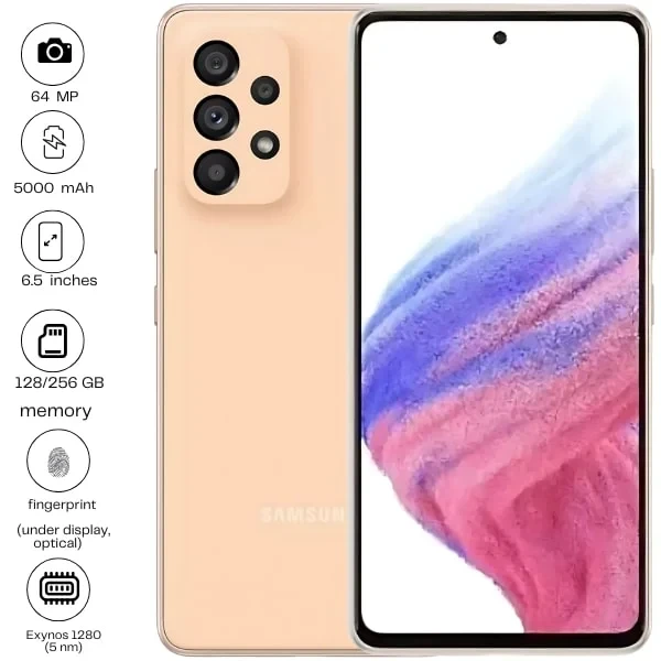 The Samsung Galaxy A53 5G features a 6.5" Super AMOLED display with a smooth 120Hz refresh rate. It has a powerful 64MP quad-camera setup and a 32MP front camera. Powered by a 5000mAh battery, it supports 25W fast charging. With 5G connectivity and a sleek design, it's a solid choice for everyday use.
