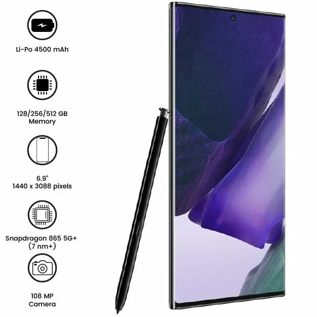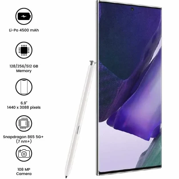 Samsung Galaxy Note 20 Ultra 5G is a premium smartphone with a 6.9-inch Dynamic AMOLED 2X display and 120Hz refresh rate. It features a Snapdragon 865+/Exynos 990 processor, 12GB RAM, and up to 512GB storage. The triple-camera setup includes a 108MP main sensor, and the 4500mAh battery supports fast charging. It also comes with an improved S Pen for enhanced productivity.